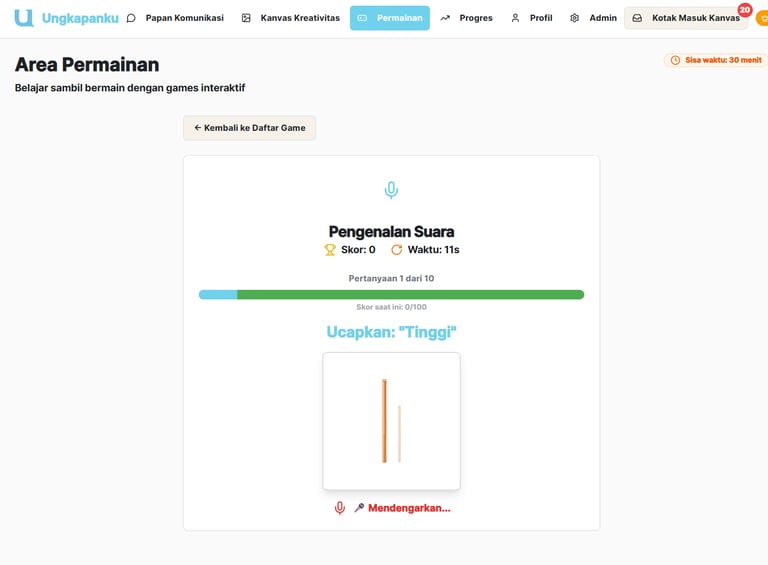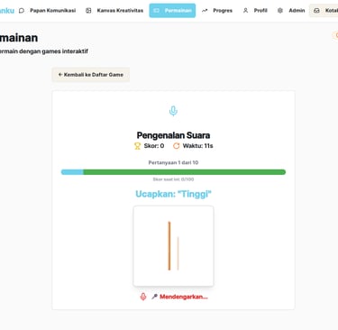 Pengenalan suara (pengguna di ajak untuk berbicara dengan panduan suara dan gambar yang sesuai) , ada total 10 pertanyaan dengan kategori pertanyaan yang dapat dipilih, setiap jawaban benar akan mendapat nilai 10