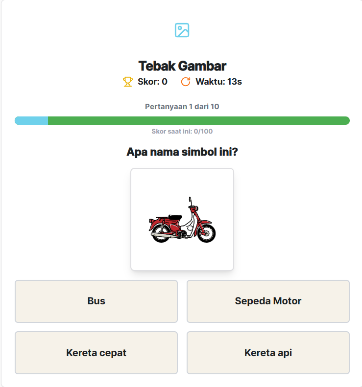 Tebak Gambar (pengguna di ajak untuk memilih gambar yang sesuai dengan 4 pilihan kata) , ada total 10 pertanyaan dengan kategori pertanyaan yang dapat dipilih, setiap jawaban benar akan mendapat nilai 10