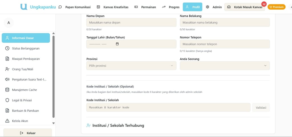 • Pada halaman profil, pastikan anda mengisi identitas pengguna dan kode institusi jika ada untuk pengalaman yang lebih optimal dalam komunikasi antar pengguna (guru,orang tua,terapis)